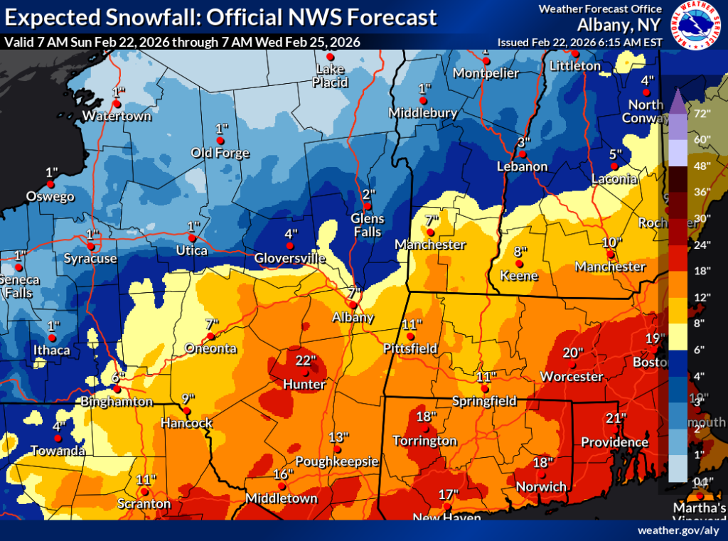 According to the National Weather Service in Albany, the forecast is calling for the Village of Middleburgh and the surrounding Schoharie County area to receive anywhere from twelve to eighteen inches of snow between Sunday afternoon and Monday afternoon.